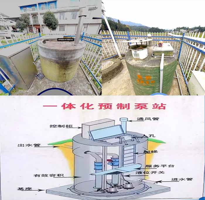 (桑枣镇烈云村7组(左)、沸水镇枫香(右)提升站场景之一,及所采用的一体化预制泵站原理)