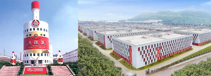 (四千多年酿酒史,以高粱、大米、糯米、小麦、玉米为主导,以“种、酿、选、陈、调”现代工艺生产的五粮液酒宜宾城市标志和其厂房)