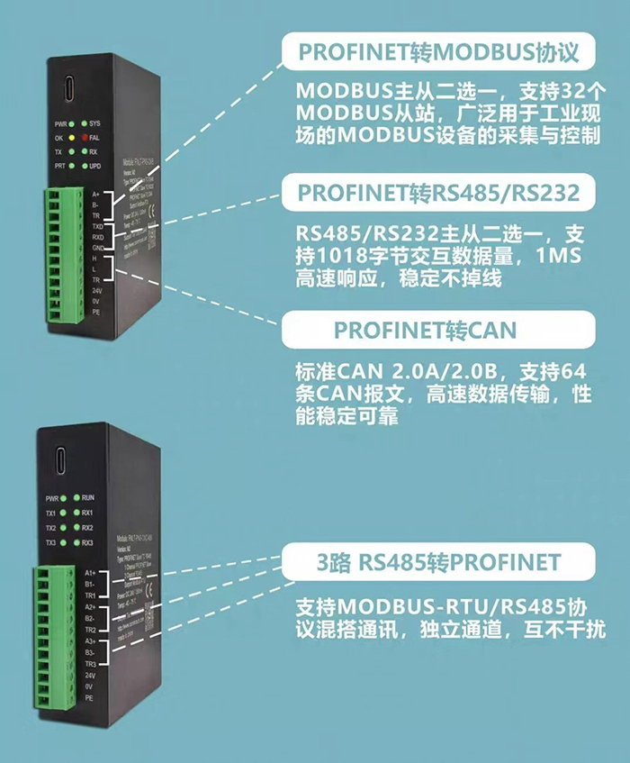 GD-PNS-CMB的串口接口支持 MODBUS-RTU 协议、RS自由协议、CAN协议等。
